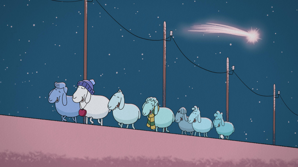 In einer klaren Winternacht vor langer, langer Zeit, vielleicht im ersten oder zweiten Jahr unserer Zeitgeschichte passiert etwas völlig Unerwartetes: Plötzlich taucht ein unbekanntes Flugobjekt am Himmel auf. Schafe, die auf dem Feld schlafen, wachen erschreckt auf und sind verwirrt, da ihre Hirten nicht da sind. Doch eines der Schafe hat eine Botschaft -unvollständig -von Lichtgestalten mitbekommen. Es geht um ein Menschenbaby, welches geboren wurde und irgendwann einmal die ganze Welt retten soll. Schleunigst machen sich die Schafe auf die Suche nach dem Kind. Sie müssen dabei Hindernisse wie einen Fluss überqueren. Und sie begegnen u.a. einem Esel, der erzählt, dass er bereits bei dem Baby war und dass jeder Besucher dem Kind ein Geschenk gebracht hat, einem Ochsen, der ihnen von der Geburt erzählt. - Da sie auf dem Weg viel Zeit verloren haben, beeilen sie sich umso mehr. Allen voran „das letzte Schaf“. Gespannt darauf, was die Herde erwartet, prescht es voran. Der Stern führt sie schließlich zum Ziel. Doch vor dem Stall erwartet sie eine Überraschung. Drei Dromedare erklären ihnen, dass sie zu spät kommen und bereits alles vorbei ist. Der Vater des Neugeborenen habe einen Traum gehabt, in dem er aufgefordert worden sei, mit seiner Familie zu fliehen, da der König dem Neugeborenen nachstelle. Es handele sich auch nicht um ein Mädchen, sondern einen Jungen. Die Schafe überlegen kurz: Dann stimmen sie (ihr Geschenk) trotzdem an – „ihr“ Lied für das Neugeborene: „Stille Nacht“. Es klingt nicht so ganz aufeinander abgestimmt, aber darum geht es nicht. Langsam machen sie sich auf den Nachhauseweg zurück zu den Hirten.